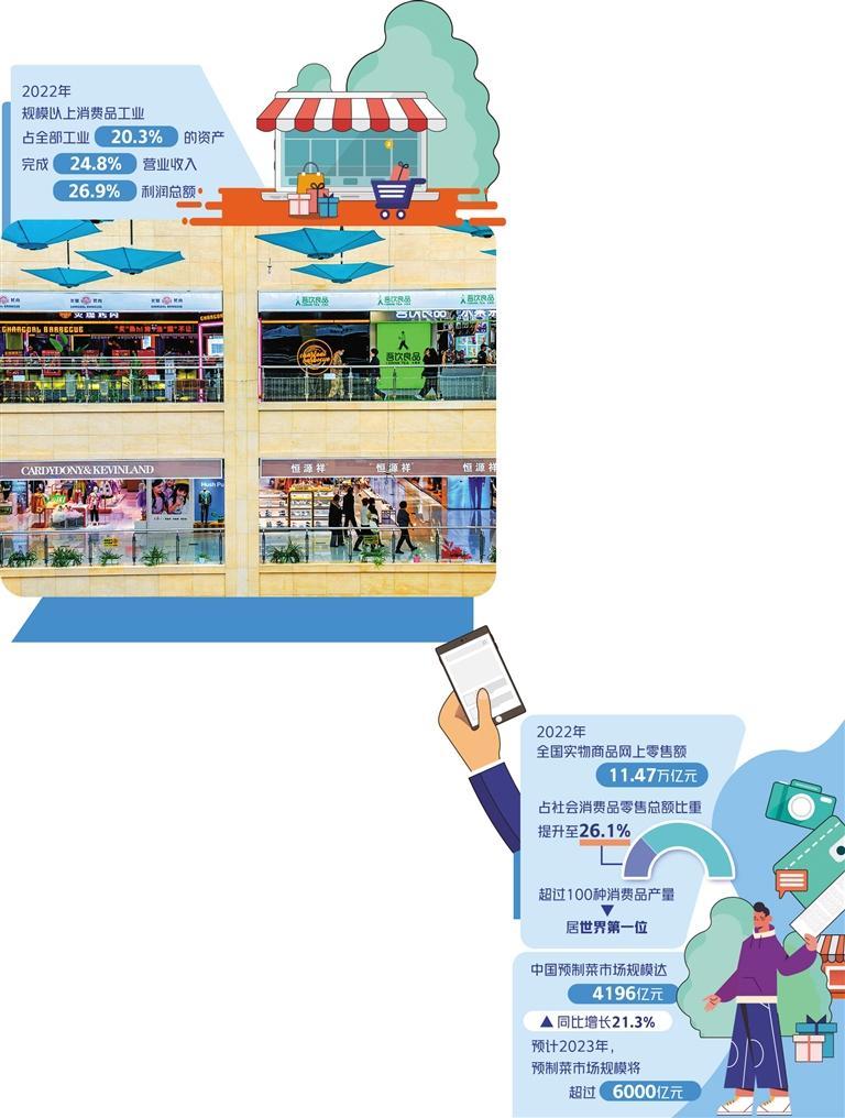 过去的一年,消费品工业发展更具有含“数”量。消费品工业数字化赋能步伐明显提速,智慧设计、柔性制造、供应链协同等关键环节的集成创新和融合应用能力大幅增强。个性化设计、柔性化生产在更多行业得到大力推广,C2M电商、兴趣电商由平台经济向实体经济融合渗透。2022年全国实物商品网上零售额达11.47万亿元,占社会消费品零售总额的比重提升至26.1%,其中,“吃”“穿”“用”类商品网上零售额持续扩大,同比分别增长16.1%、3.5%、5.7%。
