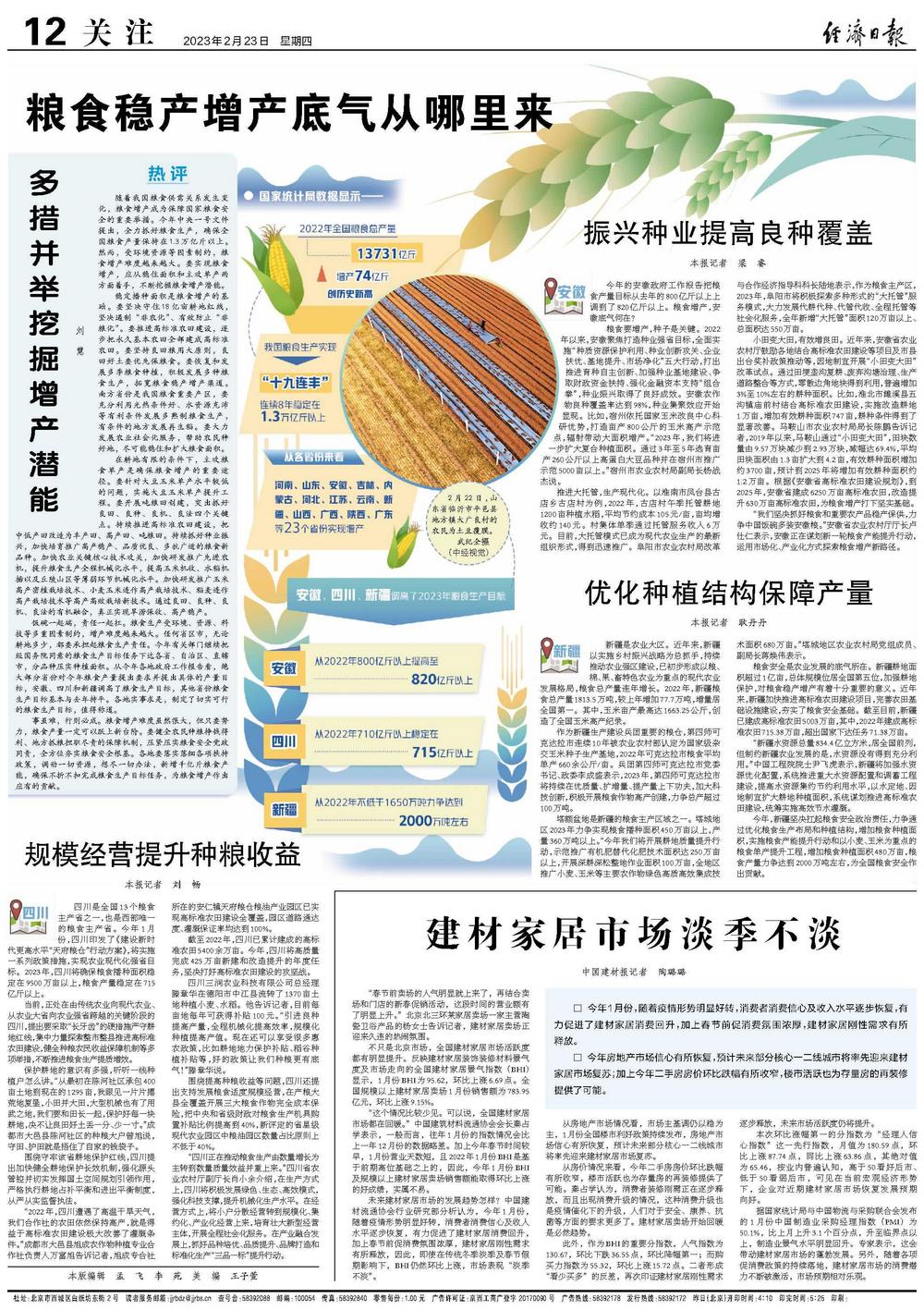 今年,新疆坚决扛起粮食安全政治责任,力争通过优化粮食生产布局和种植结构,增加粮食种植面积,实施粮食产能提升行动和以小麦、玉米为重点的粮食单产提升工程,增加粮食种植面积480万亩,粮食产量力争达到2000万吨左右,为全国粮食安全作出贡献。