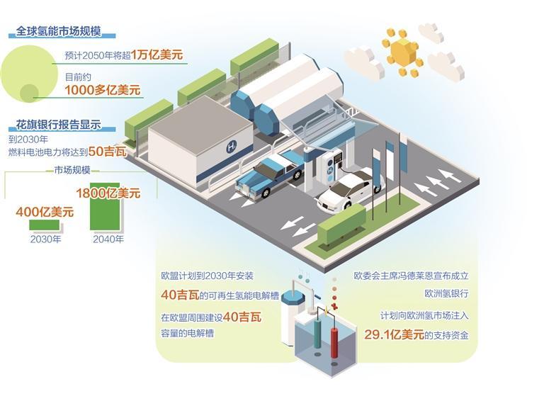 其中一个被特别看好的产品就是燃料电池。业内人士分析认为,燃料电池行业是绿色能源的重要组成部分,其技术性能是干电池无法达到的,特别适用于叉车、商用车和船舶等特种运输工具以及普通能源消费,既可以部分替代电网供电,同时还具备较低成本和供给可靠等优势。花旗银行研究报告显示,到2030年,燃料电池电力将达到50吉瓦,市场规模为400亿美元;到2040年将进一步增加至1800亿美元。欧盟计划到2030年在各成员国安装40吉瓦的可再生氢能电解槽,同时在欧盟周围建设40吉瓦容量的电解槽。