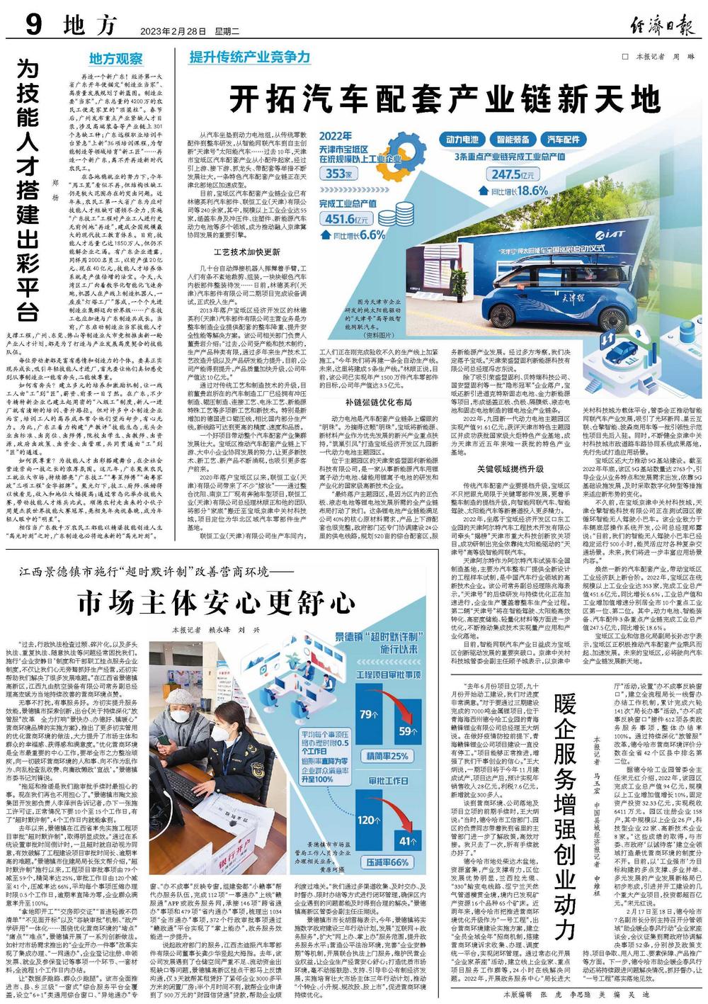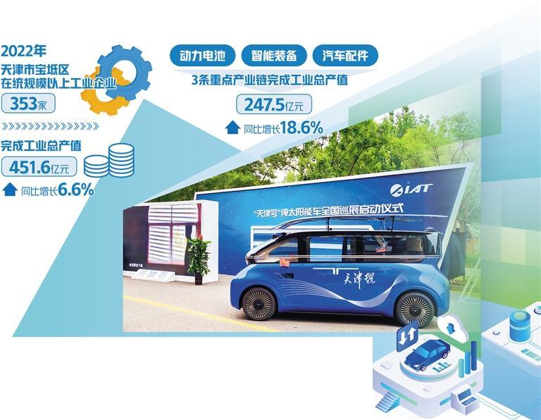 焕然一新的汽车配套产业,带动宝坻区工业经济跃上新台阶。2022年,宝坻区在统规模以上工业企业达353家,完成工业总产值451.6亿元,同比增长6.6%,工业总产值和工业增加值增速分别居全市10个重点工业区第一位、第二位。其中,动力电池、智能装备、汽车配件3条重点产业链完成工业总产值247.5亿元,同比增长18.6%。