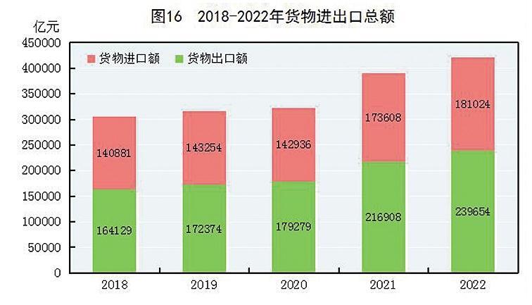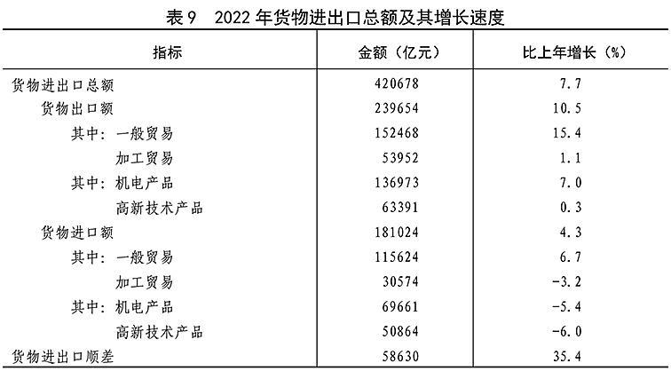 全年货物进出口总额420678亿元,比上年增长7.7%。其中,出口239654亿元,增长10.5%;进口181024亿元,增长4.3%。货物进出口顺差58630亿元,比上年增加15330亿元。对“一带一路”[40]沿线国家进出口总额138339亿元,比上年增长19.4%。其中,出口78877亿元,增长20.0%;进口59461亿元,增长18.7%。对《区域全面经济伙伴关系协定》(RCEP)其他成员国^[41]进出口额129499亿元,比上年增长7.5%。