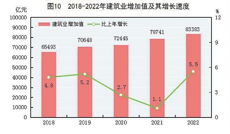 全年建筑业增加值83383亿元,比上年增长5.5%。全国具有资质等级的总承包和专业承包建筑业企业利润8369亿元,比上年下降1.2%,其中国有控股企业3922亿元,增长8.4%。