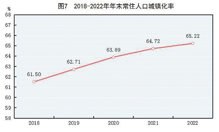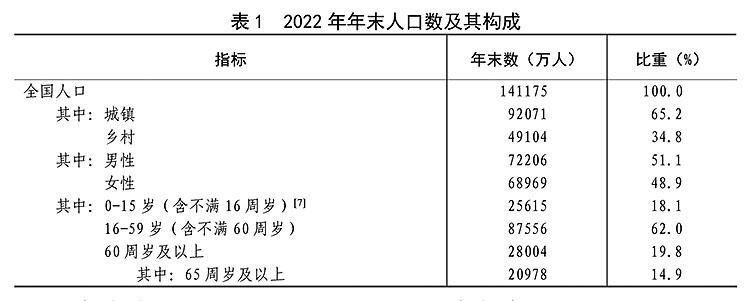 年末全国人口^[6]141175万人,比上年末减少85万人,其中城镇常住人口92071万人。全年出生人口956万人,出生率为6.77‰;死亡人口1041万人,死亡率为7.37‰;自然增长率为-0.60‰。