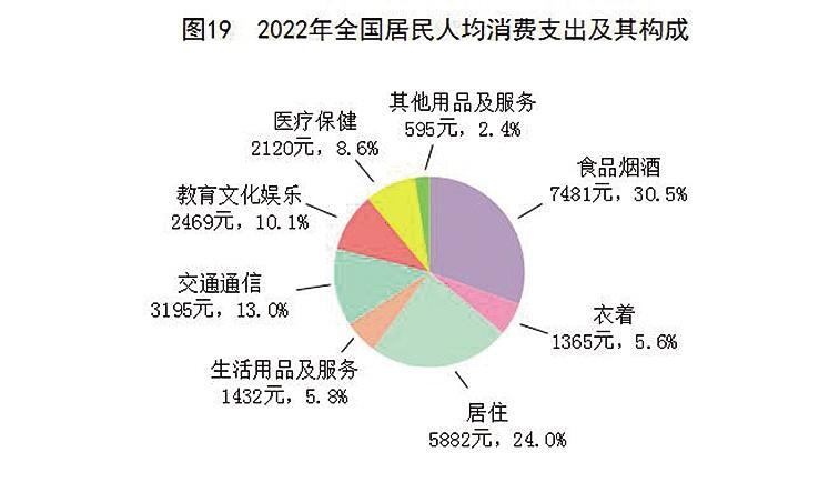 全年全国居民人均消费支出24538元,比上年增长1.8%,扣除价格因素,实际下降0.2%。其中,人均服务性消费支出^[54]10590元,比上年下降0.5%,占居民人均消费支出的比重为43.2%。按常住地分,城镇居民人均消费支出30391元,增长0.3%,扣除价格因素,实际下降1.7%;农村居民人均消费支出16632元,增长4.5%,扣除价格因素,实际增长2.5%。全国居民恩格尔系数为30.5%,其中城镇为29.5%,农村为33.0%。