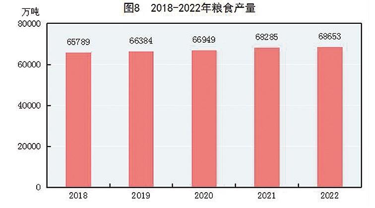 全年粮食产量68653万吨,比上年增加368万吨,增产0.5%。其中,夏粮产量14740万吨,增产1.0%;早稻产量2812万吨,增产0.4%;秋粮产量51100万吨,增产0.4%。全年谷物产量63324万吨,比上年增产0.1%。其中,稻谷产量20849万吨,减产2.0%;小麦产量13772万吨,增产0.6%;玉米产量27720万吨,增产1.7%。大豆产量2028万吨,增产23.7%。
