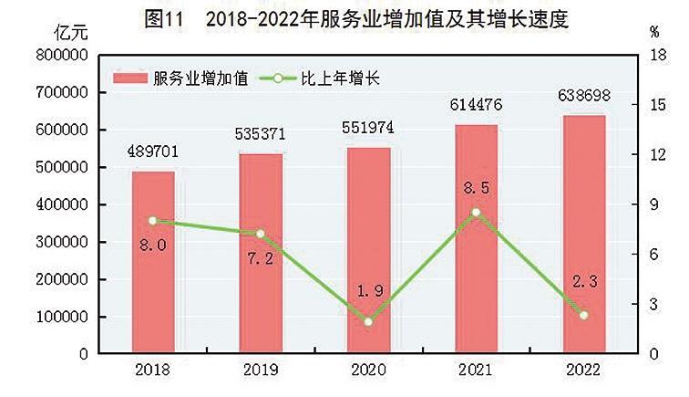 全年批发和零售业增加值114518亿元,比上年增长0.9%;交通运输、仓储和邮政业增加值49674亿元,下降0.8%;住宿和餐饮业增加值17855亿元,下降2.3%;金融业增加值96811亿元,增长5.6%;房地产业增加值73821亿元,下降5.1%;信息传输、软件和信息技术服务业增加值47934亿元,增长9.1%;租赁和商务服务业增加值39153亿元,增长3.4%。全年规模以上服务业企业营业收入比上年增长2.7%,利润总额增长8.5%。