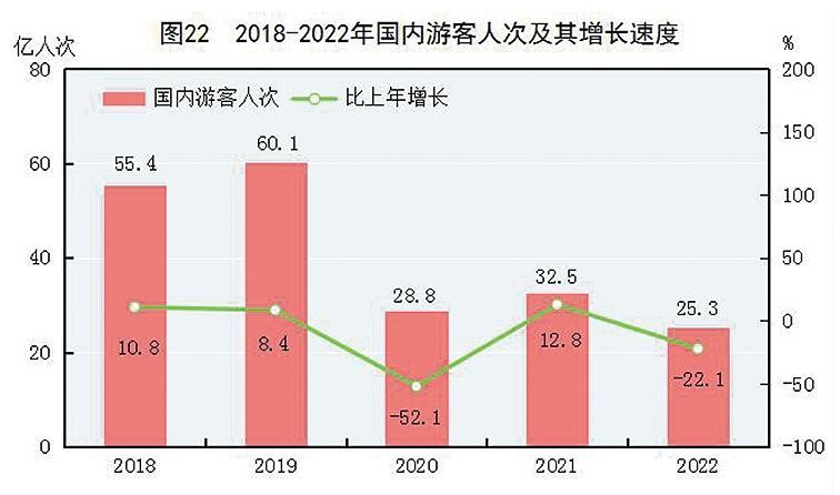 全年国内游客25.3亿人次,比上年下降22.1%。其中,城镇居民游客19.3亿人次,下降17.7%;农村居民游客6.0亿人次,下降33.5%。国内旅游收入20444亿元,下降30.0%。其中,城镇居民游客花费16881亿元,下降28.6%;农村居民游客花费3563亿元,下降35.8%。
