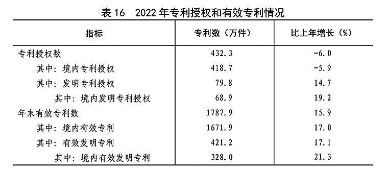 全年研究与试验发展(R&D)经费支出30870亿元,比上年增长10.4%,与国内生产总值之比为2.55%,其中基础研究经费1951亿元。国家自然科学基金共资助5.19万个项目。截至年末,正在运行的国家重点实验室533个,纳入新序列管理的国家工程研究中心191个,国家企业技术中心1601家,大众创业万众创新示范基地212家。国家科技成果转化引导基金累计设立36只子基金,资金总规模624亿元。国家级科技企业孵化器^[59]1425家,国家备案众创空间^[60]2441家。全年授予专利权432.3万件,比上年下降6.0%;PCT专利申请受理量^[61]7.4万件。截至年末,有效专利1787.9万件,其中境内有效发明专利328.0万件。每万人口高价值发明专利拥有量^[62]9.4件。全年商标注册617.7万件,比上年下降20.2%。全年共签订技术合同77万项,技术合同成交金额47791亿元,比上年增长28.2%。我国公民具备科学素质^[63]的比例达到12.93%。