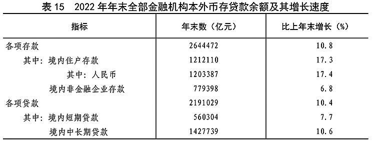 全年社会融资规模增量[43]32.0万亿元,按可比口径计算,比上年多0.7万亿元。年末社会融资规模存量^[44]344.2万亿元,按可比口径计算,比上年末增长9.6%,其中对实体经济发放的人民币贷款余额212.4万亿元,增长10.9%。年末全部金融机构本外币各项存款余额264.4万亿元,比年初增加25.9万亿元,其中人民币各项存款余额258.5万亿元,增加26.3万亿元。全部金融机构本外币各项贷款余额219.1万亿元,增加20.6万亿元,其中人民币各项贷款余额214.0万亿元,增加21.3万亿元。人民币普惠金融贷款^[45]余额32.1万亿元,增加5.6万亿元。