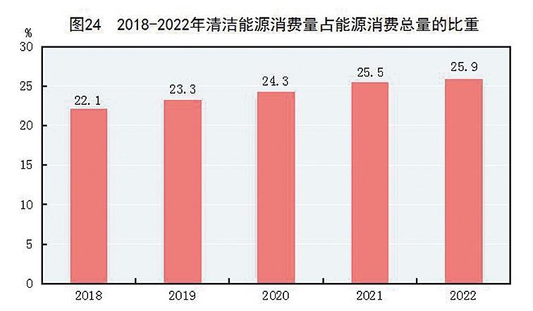 绿色转型发展迈出新步伐。全年全国万元国内生产总值能耗^[19]比上年下降0.1%。全年水电、核电、风电、太阳能发电等清洁能源发电量29599亿千瓦时,比上年增长8.5%。在监测的339个地级及以上城市中,全年空气质量达标的城市占62.8%,未达标的城市占37.2%;细颗粒物(PM_2.5)年平均浓度29微克/立方米,比上年下降3.3%。3641个国家地表水考核断面中,全年水质优良(Ⅰ~Ⅲ类)断面比例为87.9%,Ⅳ类断面比例为9.7%,Ⅴ类断面比例为1.7%,劣Ⅴ类断面比例为0.7%。