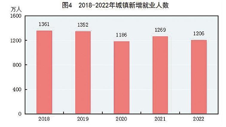 年末全国就业人员73351万人,其中城镇就业人员45931万人,占全国就业人员比重为62.6%。全年城镇新增就业1206万人,比上年少增63万人。全年全国城镇调查失业率平均值为5.6%。年末全国城镇调查失业率为5.5%。全国农民工^[8]总量29562万人,比上年增长1.1%。其中,外出农民工17190万人,增长0.1%;本地农民工12372万人,增长2.4%。
