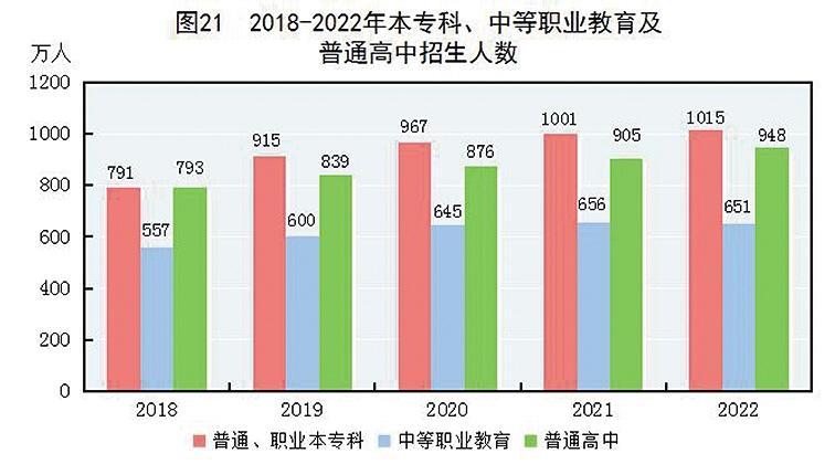 全年研究生教育招生124.2万人,在学研究生365.4万人,毕业生86.2万人。普通、职业本专科^[65]招生1014.5万人,在校生3659.4万人,毕业生967.3万人。中等职业教育^[66]招生650.7万人,在校生1784.7万人,毕业生519.2万人。普通高中招生947.5万人,在校生2713.9万人,毕业生824.1万人。初中招生1731.4万人,在校生5120.6万人,毕业生1623.9万人。普通小学招生1701.4万人,在校生10732.0万人,毕业生1740.6万人。特殊教育招生14.6万人,在校生91.9万人,毕业生15.9万人。学前教育在园幼儿4627.5万人。九年义务教育巩固率为95.5%,高中阶段毛入学率为91.6%。