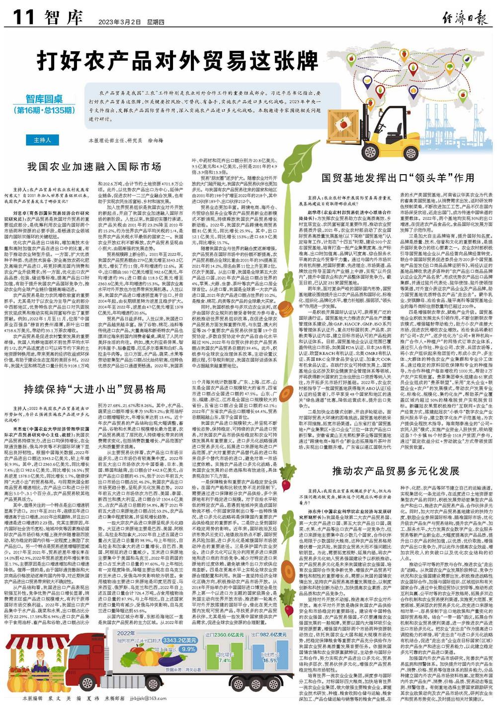 刘艺卓(商务部国际贸易经济合作研究院研究员):农产品贸易是我国对外贸易的重要组成部分,是统筹利用农业国内国际两个市场两种资源的必要手段,是畅通农业领域国内国际双循环的关键枢纽。