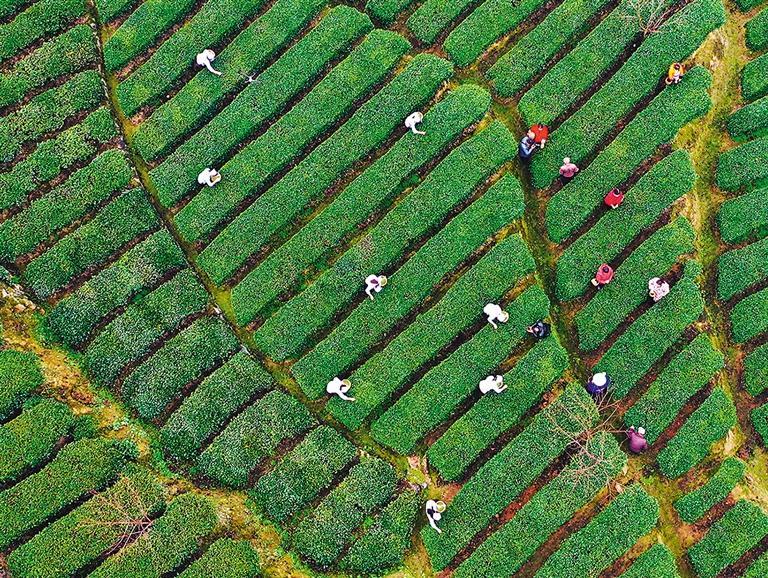 三月一日,湖北省宜昌市秭归县茅坪镇中坝子村早茶基地,茶农开采新茶。目前,宜昌累计发展茶园九十九万亩,早市茶叶成为三峡坝库区农业特色产业。黄善军摄(中经视觉)