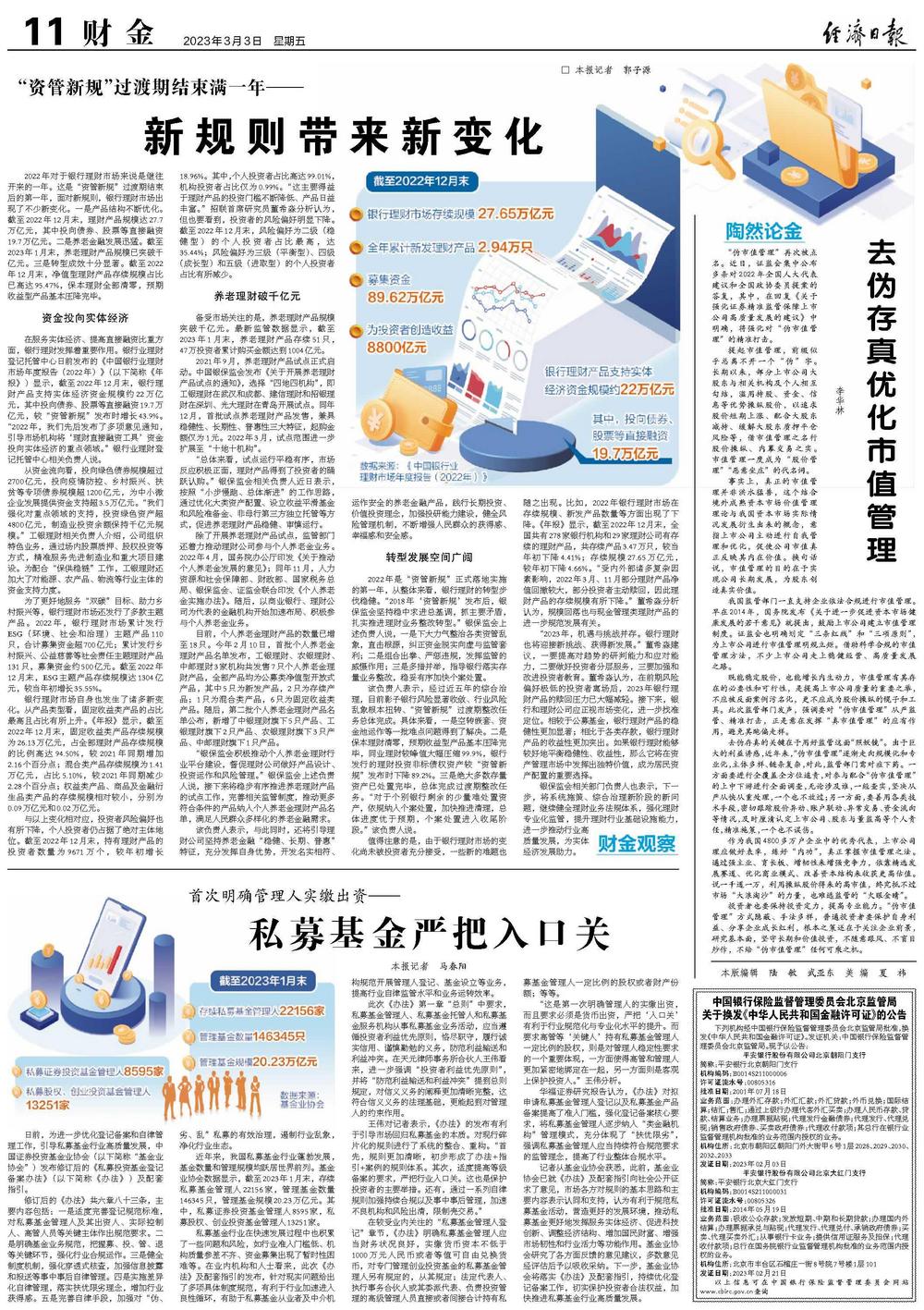 2022年对于银行理财市场来说是继往开来的一年。这是“资管新规”过渡期结束后的第一年,面对新规则,银行理财市场出现了不少新变化。一是产品结构不断优化。截至2022年12月末,理财产品规模达27.7万亿元,其中投向债券、股票等直接融资19.7万亿元。二是养老金融发展迅猛。截至2023年1月末,养老理财产品规模已突破千亿元。三是转型成效十分显著。截至2022年12月末,净值型理财产品存续规模占比已高达95.47%,保本理财全部清零,预期收益型产品基本压降完毕。