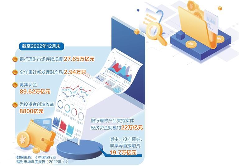 在服务实体经济、提高直接融资比重方面,银行理财发挥着重要作用。银行业理财登记托管中心日前发布的《中国银行业理财市场年度报告(2022年)》(以下简称《年报》)显示,截至2022年12月末,银行理财产品支持实体经济资金规模约22万亿元,其中投向债券、股票等直接融资19.7万亿元,较“资管新规”发布时增长43.9%。“2022年,我们先后发布了多项意见通知,引导市场机构将‘理财直接融资工具’资金投向实体经济的重点领域。”银行业理财登记托管中心相关负责人说。