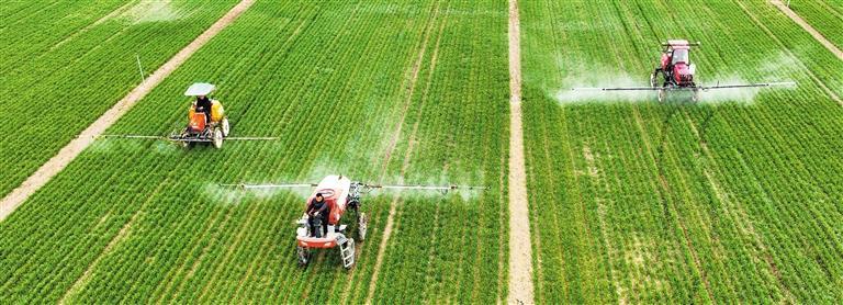 ◀二月二十八日,安徽省亳州市谯城区赵桥乡双楼村,植保人员驾驶自走式高杆喷雾机进行小麦田间除草、防治病虫害等田管作业。刘勤利摄(中经视觉)
