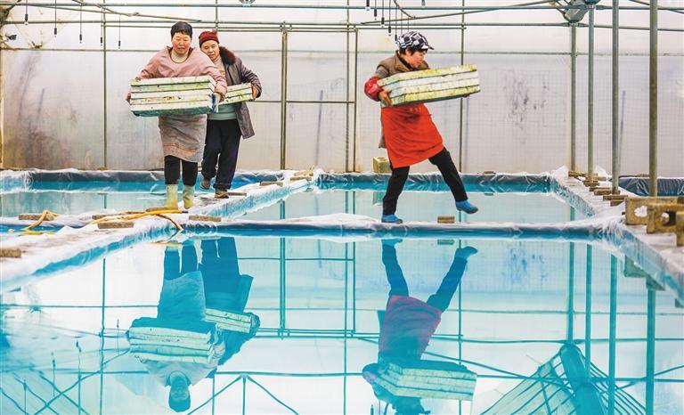 ▼2月24日,贵州省纳雍县寨乐镇雍厚社区智能大棚内,农民在搬运育苗漂盘。当地农民采用科学育苗方法,为增产增收打下基础。周训超摄(中经视觉)