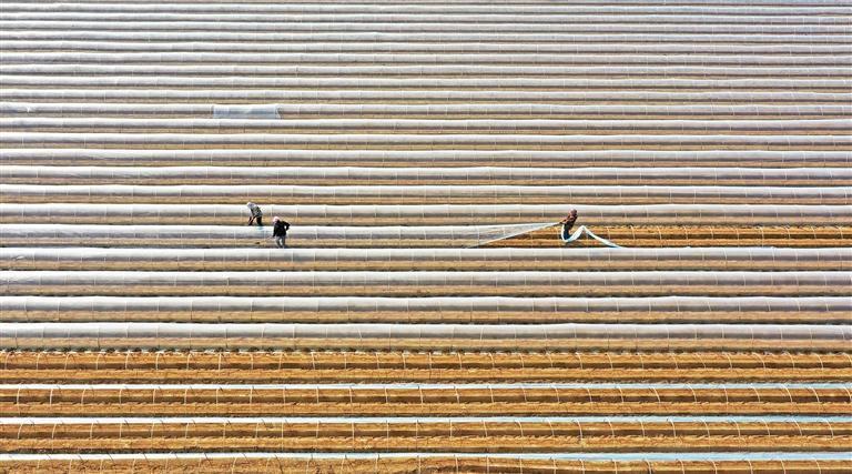▼2月27日,河南省孟州市会昌街道办事处中曹村思红种植专业合作社,种植户抢抓晴好天气,在黄河滩地播种胡萝卜。