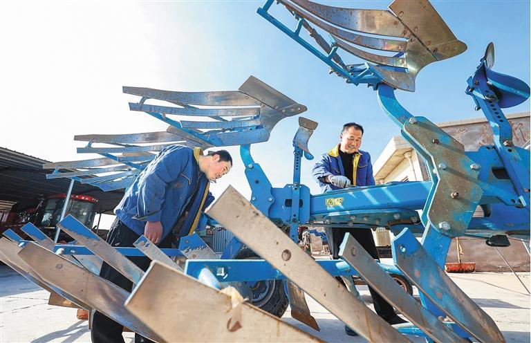 ▼2月20日,甘肃省临泽县耘野农机服务专业合作社,工人在检修春耕农机设备,确保春耕生产顺利开展。殷 旭摄(中经视觉)