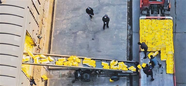 ◀2月21日,江苏省连云港市东海县火车站货场,化肥、种子等农资通过火车专列发往全国各地,以满足春耕备种市场需求。