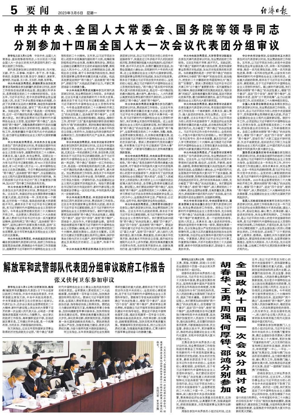新华社北京3月5日电(记者张汨汨、梅常伟)解放军和武警部队代表团5日下午分组审议政府工作报告,中共中央政治局委员、中央军委副主席张又侠,中共中央政治局委员、中央军委副主席何卫东分别参加小组审议。代表们认为,这次会议是在全面贯彻党的二十大精神、新时代新征程上再出发的大背景下召开的第一次全国人民代表大会,必将进一步增强推进强国复兴的向心力凝聚力。会议审议的政府工作报告,高举旗帜坚定不移,总结成就实事求是,工作建议科学合理,是一个统筹布局、为民务实、开新图强的好报告。