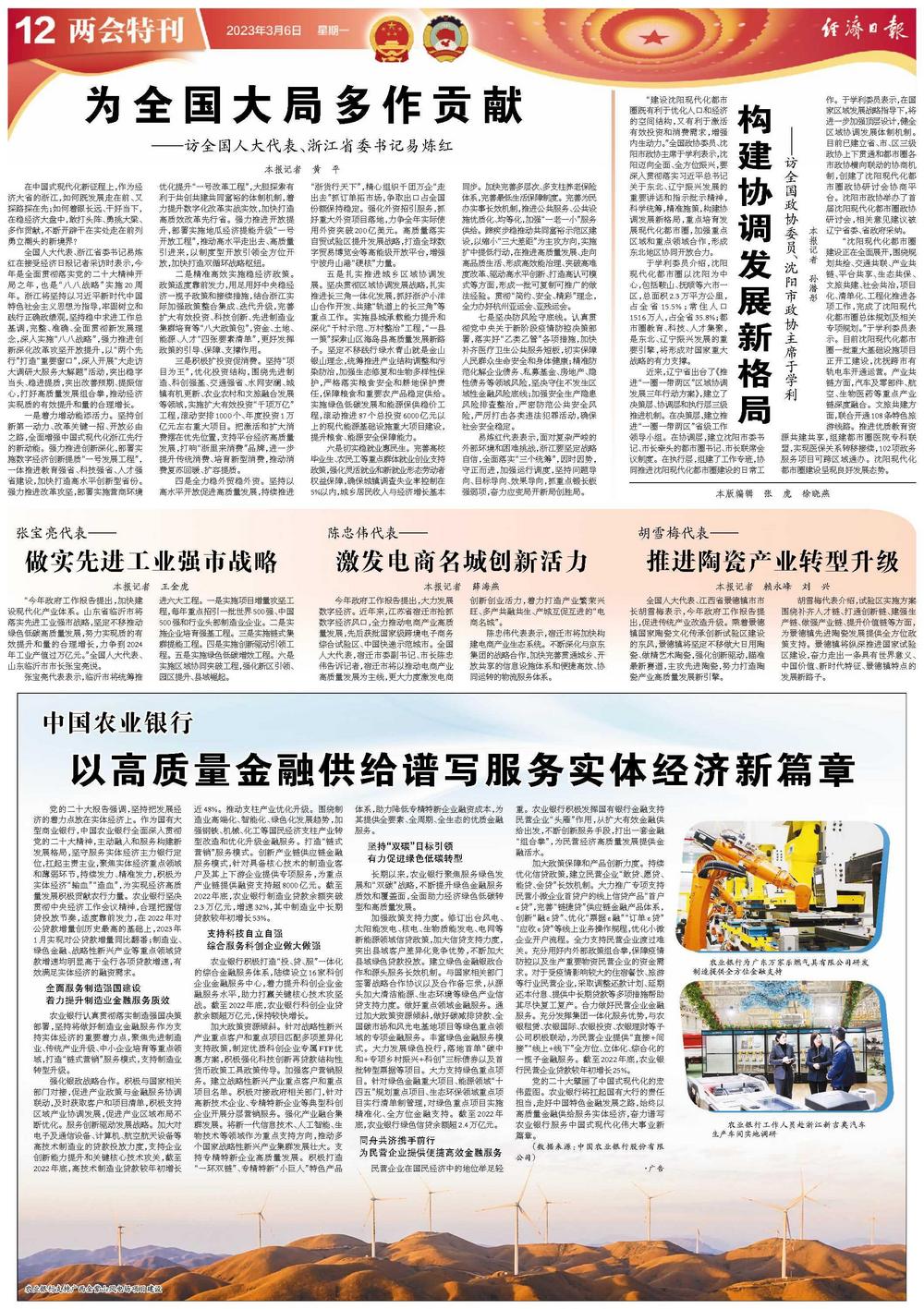 全国人大代表、浙江省委书记易炼红在接受经济日报记者采访时表示,今年是全面贯彻落实党的二十大精神开局之年,也是“八八战略”实施20周年。浙江将坚持以习近平新时代中国特色社会主义思想为指导,牢固树立和践行正确政绩观,坚持稳中求进工作总基调,完整、准确、全面贯彻新发展理念,深入实施“八八战略”,强力推进创新深化改革攻坚开放提升,以“两个先行”打造“重要窗口”,深入开展“大走访大调研大服务大解题”活动,突出稳字当头、稳进提质,突出改善预期、提振信心,打好高质量发展组合拳,推动经济实现质的有效提升和量的合理增长。