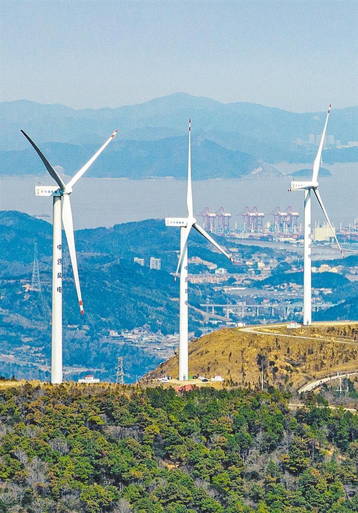 三月五日,浙江省宁波市北仑区福泉山风电场,风力发电机矗立在群山中。近年来,宁波市推进高山风能、光伏发电等绿色能源产业发展。