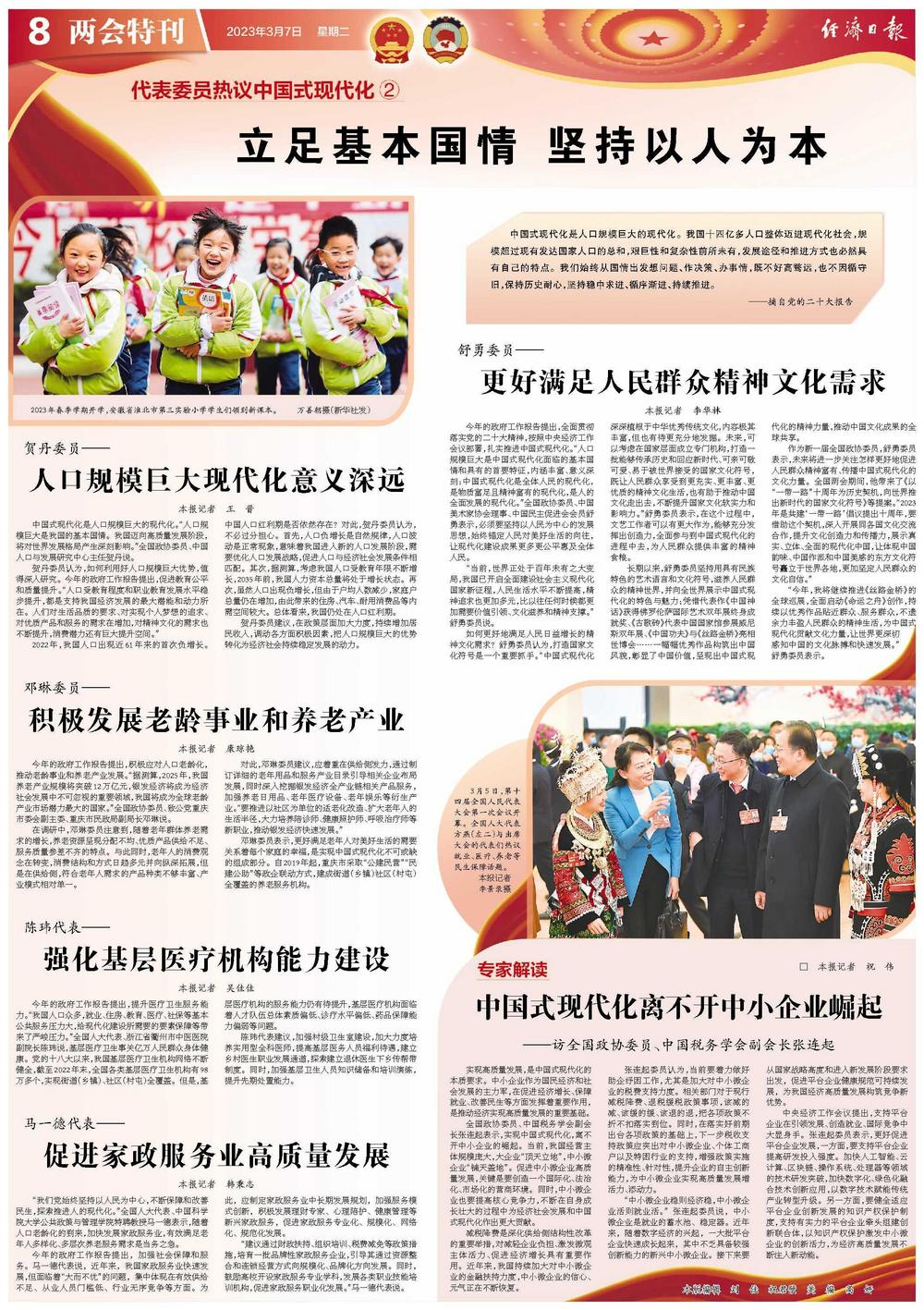 今年的政府工作报告提出,全面贯彻落实党的二十大精神,按照中央经济工作会议部署,扎实推进中国式现代化。“人口规模巨大是中国式现代化面临的基本国情和具有的首要特征,内涵丰富、意义深刻:中国式现代化是全体人民的现代化,是物质富足且精神富有的现代化,是人的全面发展的现代化。”全国政协委员、中国美术家协会理事、中国民主促进会会员舒勇表示,必须要坚持以人民为中心的发展思想,始终锚定人民对美好生活的向往,让现代化建设成果更多更公平惠及全体人民。