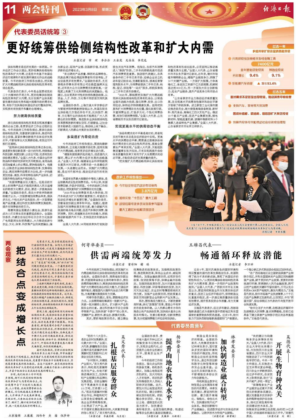 今年的政府工作报告提出,把实施扩大内需战略同深化供给侧结构性改革有机结合起来。全国政协委员、湖南省政协副主席、民盟湖南省委会主委何寄华表示,要在供需两端统筹发力,释放供给侧结构性改革和扩大内需有机结合的巨大潜力,打通经济循环堵点,增强国内大循环内生动力和可靠性,为高质量发展提供有力支撑。
