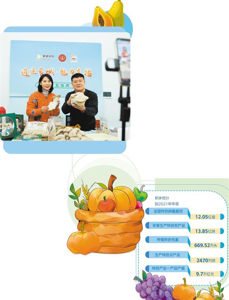 形形色色的农副产品、山清水秀的田园风光、耕读传家的文化传统,都是乡村吸引人的地方,也是乡村特色产业发展的土壤。近年来,乡村特色产业发展成效显著。初步统计,到2021年底,全国特色种植基地12.05亿亩,年度生产特色农产品13.85亿吨,养殖特色牲畜669.52万头,生产特色水产品2470万吨,特色产业一产总产值达9.7万亿元,带动了农民增收,丰富了居民餐桌。