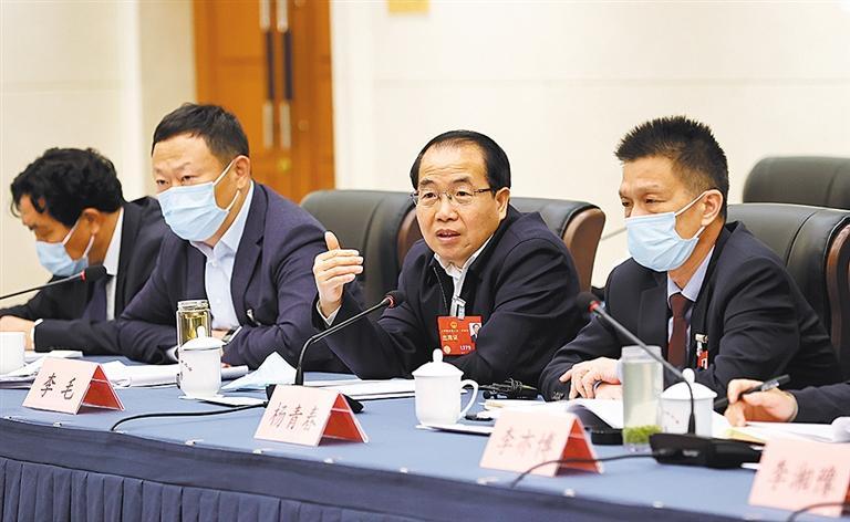 3月9日上午,十四届全国人大一次会议河南代表团举行小组会议,审议最高人民法院工作报告、最高人民检察院工作报告。图为全国人大代表李毛(右二)发言。