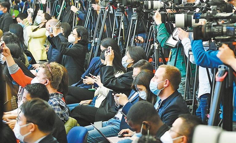 中国全国两会受到国际社会高度关注。这是中外记者在十四届全国人大一次会议举行的记者会上采访。本报记者 李景录摄