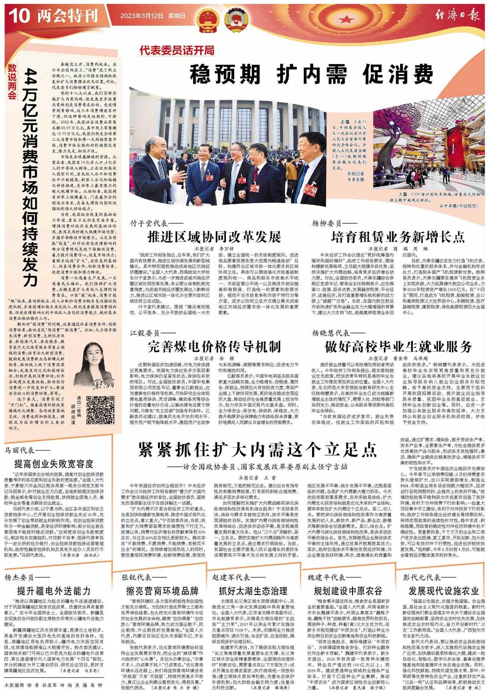 宁吉喆委员对中国经济企稳回升充满信心。今年春节以来消费回暖,2月份消费复苏势头继续扩大,出口实现微弱增长,制造业PMI、非制造业商务活动指数大幅回升,经济运行呈现预期向好、企稳向上的良好开端。“疫情防控政策平稳转段为市场复苏创造了良好环境,有利于对冲消费下行的影响;一些重大项目集中开工建设,有利于对冲投资下行的影响;政府工作报告提出经济增长等预期目标,保持宏观政策的连续性针对性,稳中求进、积极稳健,用政策的确定性对冲经济环境中的不确定性。更重要的是,千千万万的企业和工商户逐步走出困境、复工复市,开拓创新、加大投资,可以有效对冲下行惯性,促进经济较快恢复发展。”他判断,今年3月份到4月份,可能就会看到经济整体复苏的好势头。