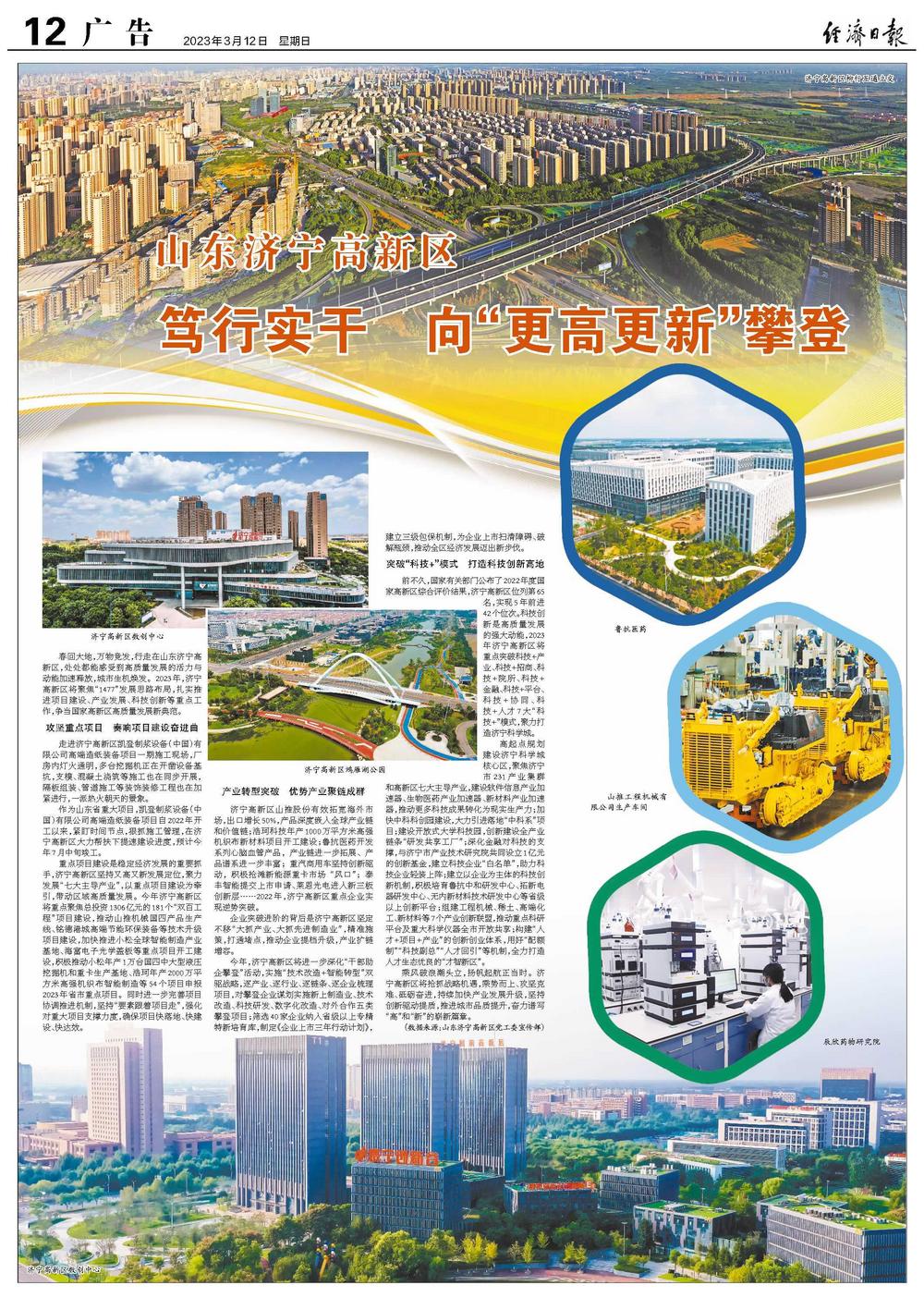 前不久,国家有关部门公布了2022年度国家高新区综合评价结果,济宁高新区位列第65名,实现5年前进42个位次。科技创新是高质量发展的强大动能,2023年济宁高新区将重点突破科技+产业、科技+招商、科技+院所、科技+金融、科技+平台、科技+协同、科技+人才7大“科技+”模式,聚力打造济宁科学城。