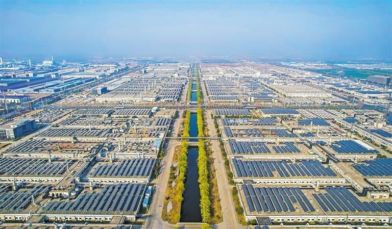 日前,江苏省宿迁市苏宿工业园区屋顶分布式光伏发电站,一排排光伏发电设备正在运行。近年来,苏宿工业园区加大企业屋顶光伏发电站的建设力度,发展清洁能源。陈少帅摄(中经视觉)
