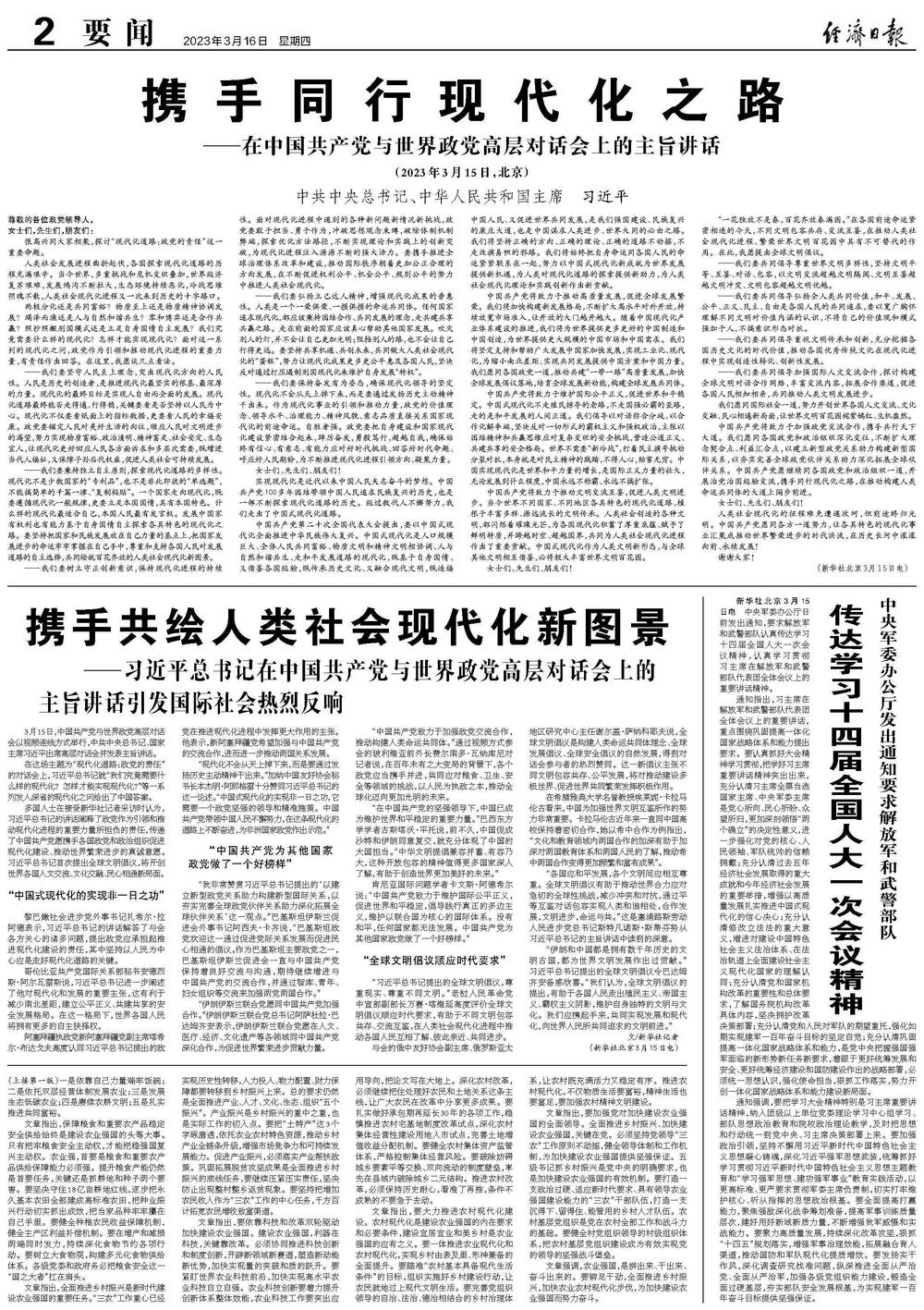 3月15日,中国共产党与世界政党高层对话会以视频连线方式举行,中共中央总书记、国家主席习近平出席高层对话会并发表主旨讲话。