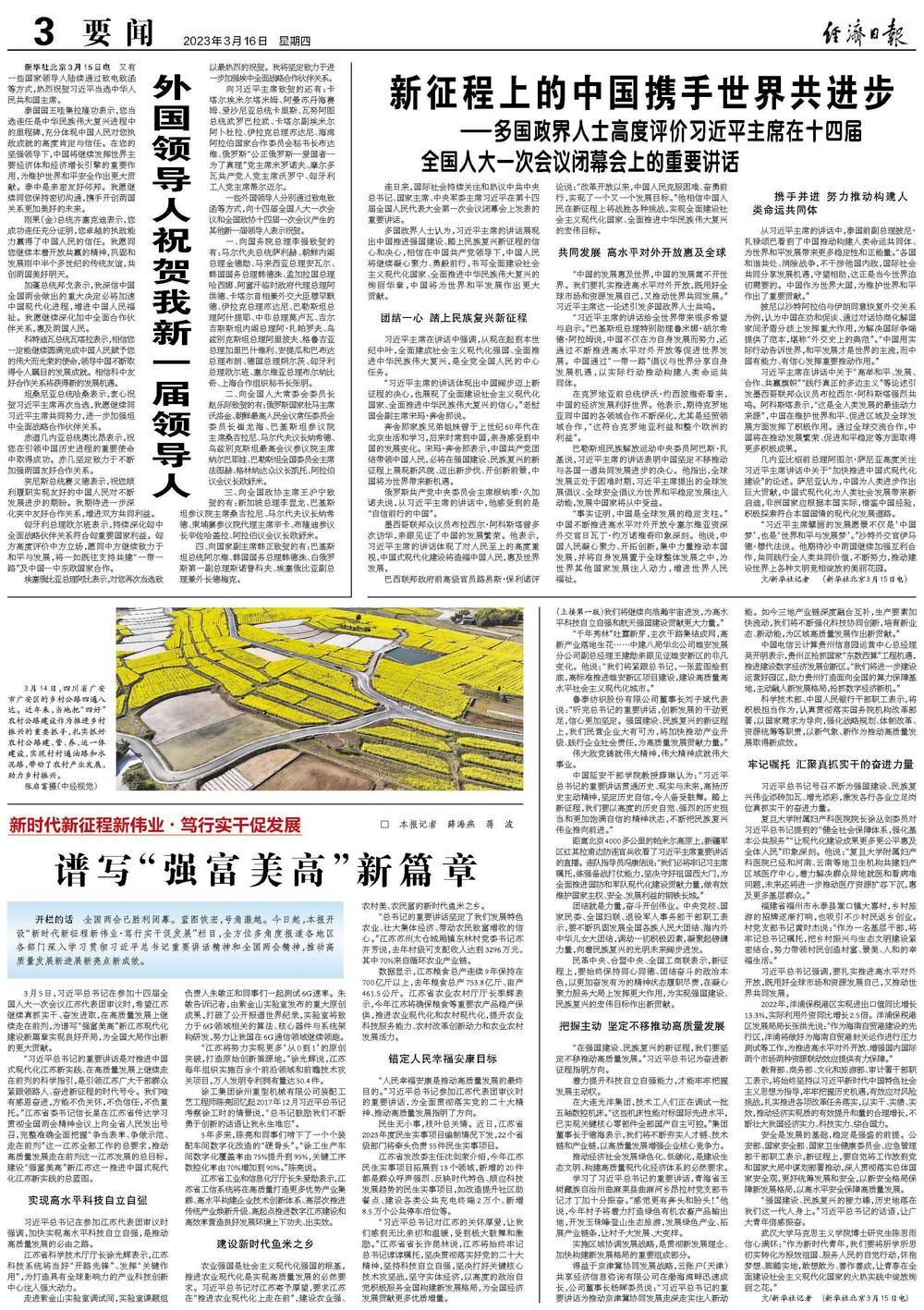 “习近平总书记的重要讲话是对推进中国式现代化江苏新实践、在高质量发展上继续走在前列的科学指引,是引领江苏广大干部群众紧跟领路人、奋进新征程的时代号令。我们唯有感恩奋进,方能不负关怀,不负信任,不负重托。”江苏省委书记信长星在江苏省传达学习贯彻全国两会精神会议上向全省人民发出号召,完整准确全面把握“争当表率、争做示范、走在前列”这一江苏全部工作的总要求,推动高质量发展走在前列这一江苏发展的总目标,建设“强富美高”新江苏这一推进中国式现代化江苏新实践的总蓝图。
