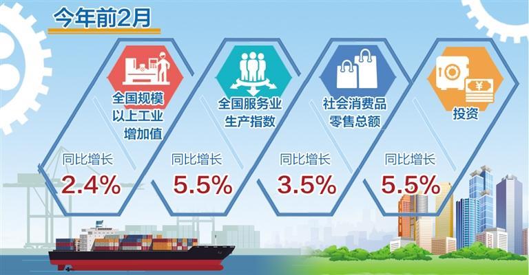 从生产看,工业和服务业双双回升。前2月,全国规模以上工业增加值同比增长2.4%,比去年12月份加快1.1个百分点;两年平均增长4.9%,回升幅度较大。全国服务业生产指数同比增长5.5%,去年12月份为下降0.8%。从需求看,消费和投资都在改善。前2月,社会消费品零售总额同比增长3.5%;投资同比增长5.5%,比去年全年加快0.4个百分点。