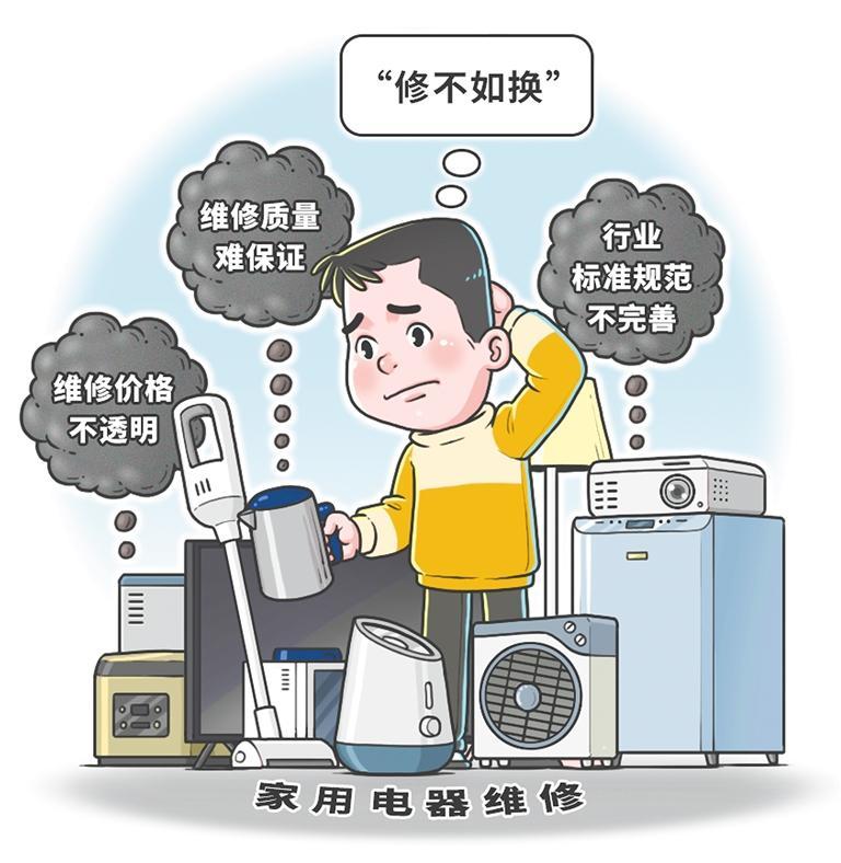 有人说,当代人的品质生活是家用电器带来的。而现实生活中,不少消费者却面临家用电器维修难题,价格不透明、质量难保证、行业标准规范不完善等,让不少消费者对家电维修望而却步,“修不如换”现象随之出现。中消协网站显示,2022年商品大类投诉中,家用电子电器类共有12万余件投诉,占比10.55%,排在商品类投诉第一位。监管部门应强化监管,尽快推进家电维修行业标准化建设,对于虚假宣传、坐地起价、冒充维修人员等行为严厉查处和打击,保障消费者权益。(时 锋)