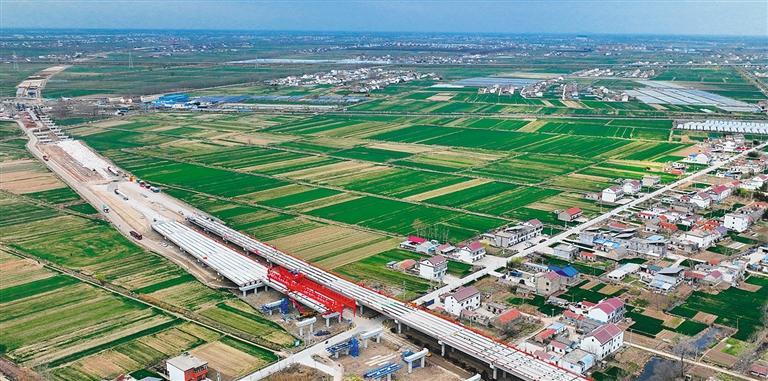 3月16日,连宿高速公路连云港段灌云东枢纽互通式立体交叉主线桥加紧施工。连(云港)宿(迁)高速公路建成通车后,将进一步完善区域高速公路网络,促进沿线经济发展。