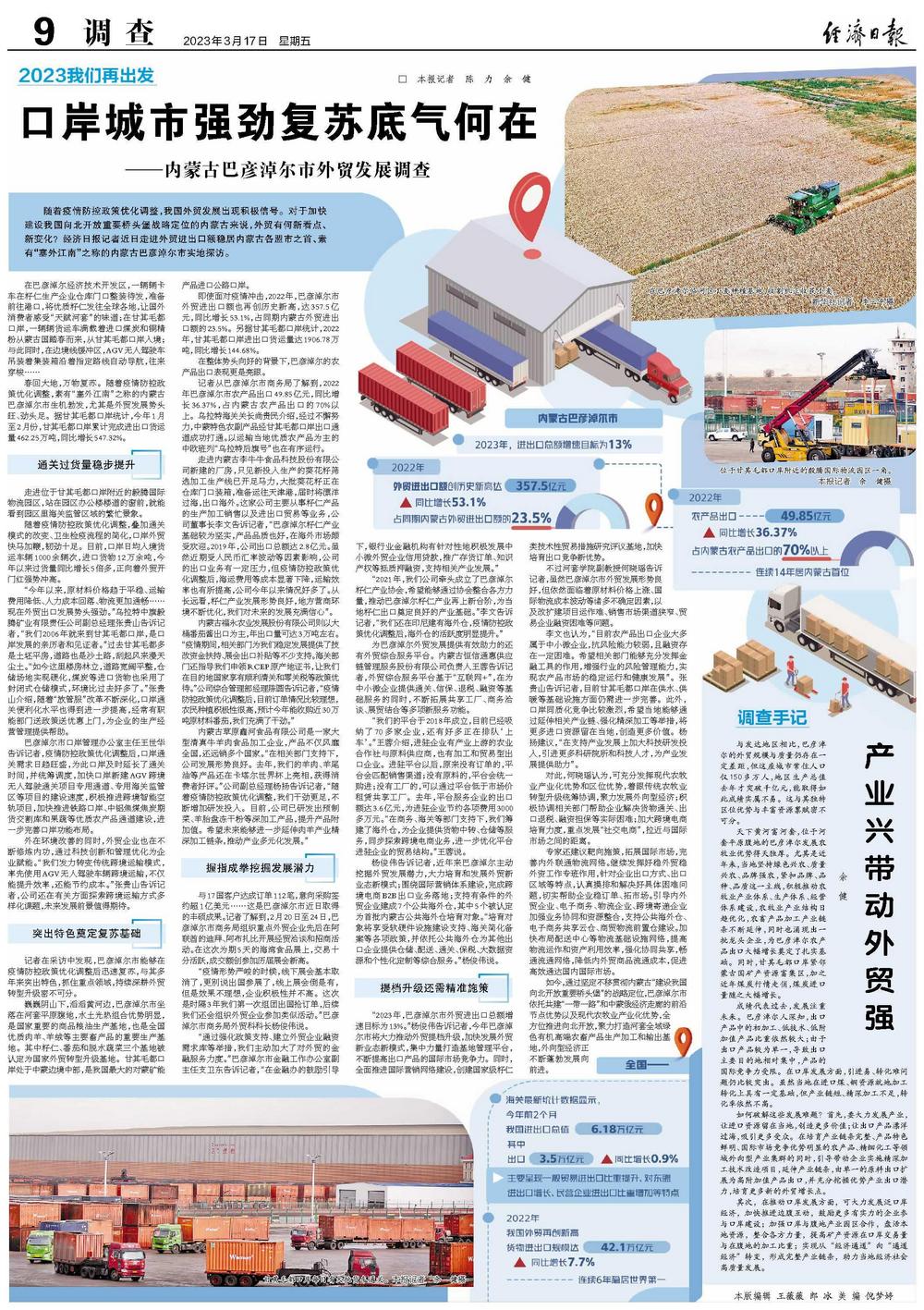 随着疫情防控政策优化调整,我国外贸发展出现积极信号。对于加快建设我国向北开放重要桥头堡战略定位的内蒙古来说,外贸有何新看点、新变化?经济日报记者近日走进外贸进出口额稳居内蒙古各盟市之首、素有“塞外江南”之称的内蒙古巴彦淖尔市实地探访。
