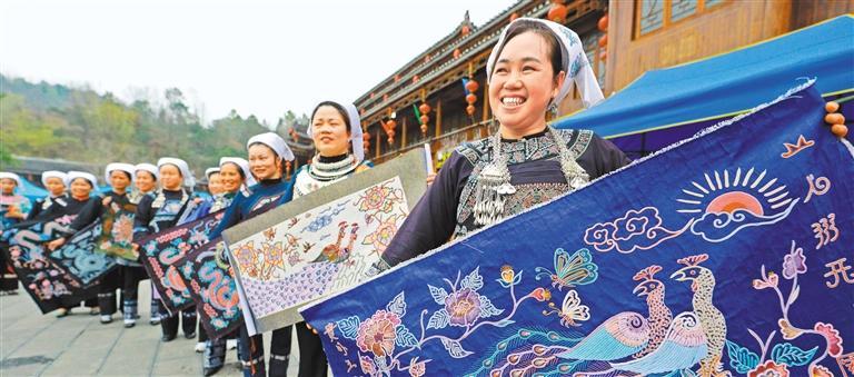 ▲贵州省三都县凤羽街道兴乐村,“绣娘”在展示比赛作品。三都县鼓励农村妇女创办非遗手工坊、专业合作社,带动3.7万余人实现就业创业、增收致富。