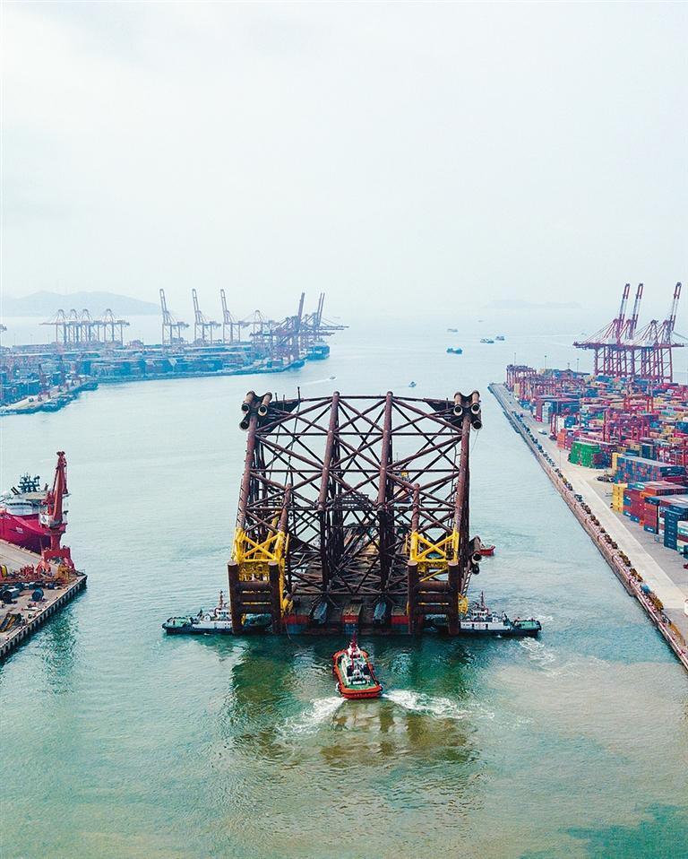 3月17日,在深圳赤湾海洋工程码头,“海洋石油228”运输驳船搭载着恩平20-4平台导管架启航,奔赴恩平油田海域。导管架平台是被广泛应用的海洋油气生产设施,恩平20-4平台是中国海油恩平15-1油田群的中心平台之一。