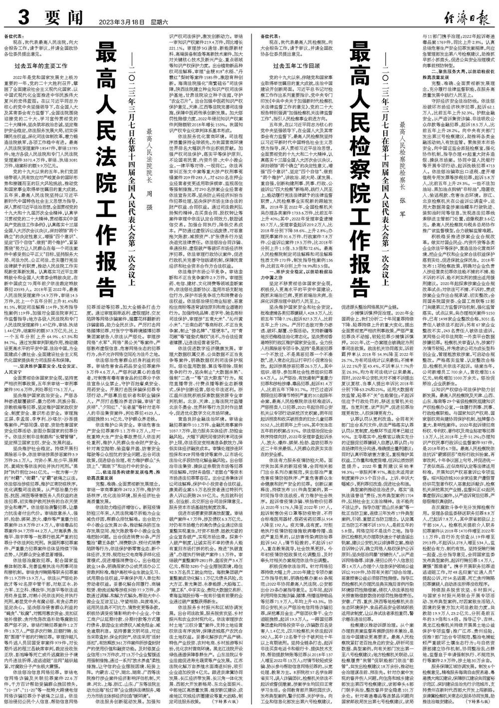 各位代表,过去五年、新时代十年,人民检察事业欣逢最好发展时期,实现职能重塑、机构重组、机制重构,这根本在于有习近平总书记作为党中央的核心、全党的核心掌舵领航,根本在于有习近平新时代中国特色社会主义思想科学指引,得益于全国人大及其常委会有力监督、国务院大力支持、全国政协民主监督,国家监察委员会、最高人民法院配合与制约,各民主党派、工商联和无党派人士、各人民团体及地方各级党政机关、各位代表、各位委员和社会各界热忱关心、支持和帮助。我谨代表最高人民检察院表示衷心感谢!