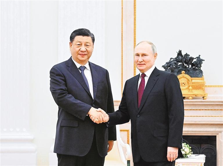 习近平指出,很高兴应普京总统邀请,再次对俄罗斯进行国事访问。十年前我就任国家主席后首次出访就选择了俄罗斯,至今记忆犹新。十年来,我同普京总统保持了密切联系。无论是我在中共二十大上连任中共中央总书记,还是前不久再次当选中国国家主席,你都第一时间给我发来贺电,我深表感谢。俄罗斯明年将举行总统选举。在你坚强领导下,俄罗斯发展振兴取得长足进展。我坚信,俄罗斯人民一定会继续给予你坚定支持。
