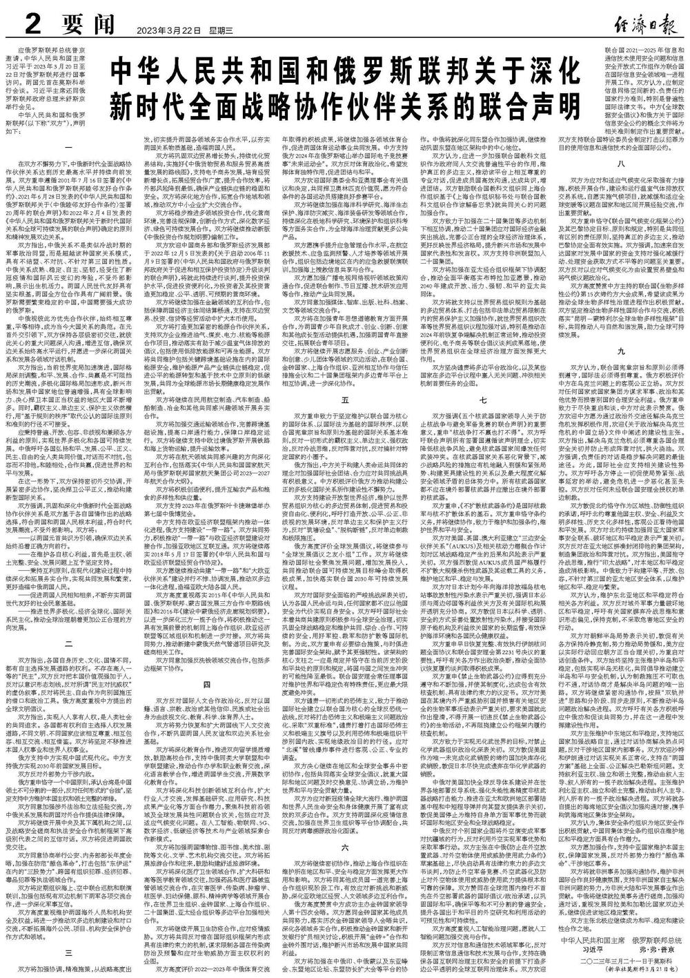 在双方不懈努力下,中俄新时代全面战略协作伙伴关系达到历史最高水平并持续向前发展。双方重申遵循2001年7月16日签署的《中华人民共和国和俄罗斯联邦睦邻友好合作条约》、2021年6月28日发表的《中华人民共和国和俄罗斯联邦关于〈中俄睦邻友好合作条约〉签署20周年的联合声明》和2022年2月4日发表的《中华人民共和国和俄罗斯联邦关于新时代国际关系和全球可持续发展的联合声明》确定的原则和精神发展双边关系。