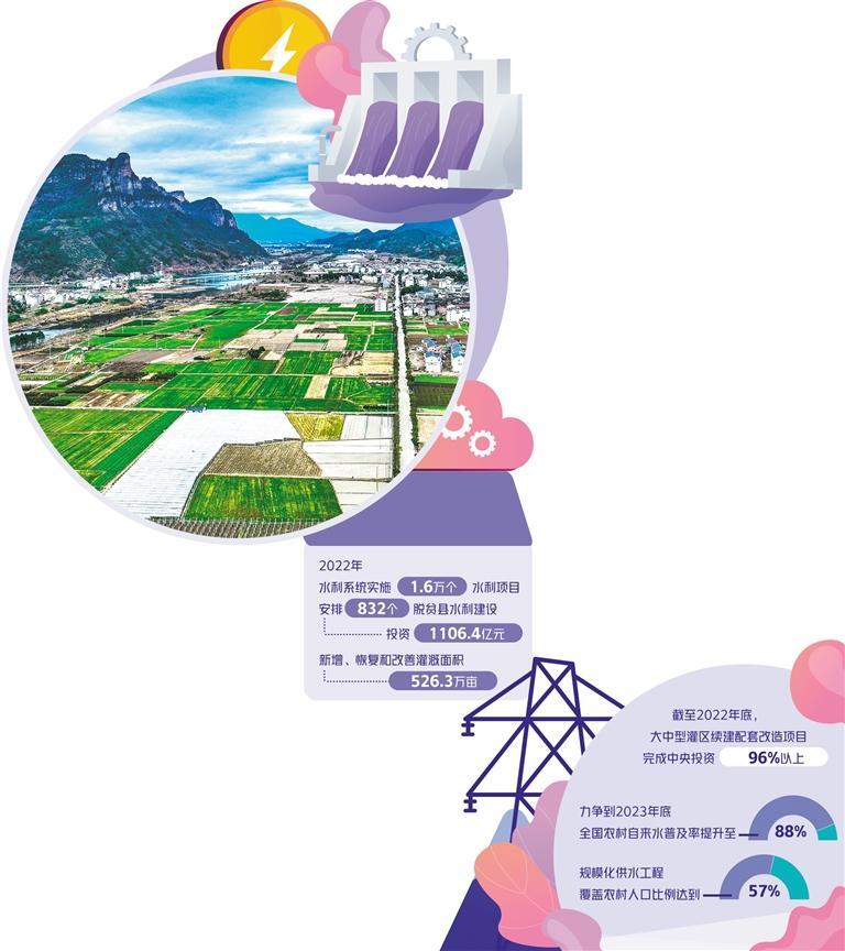 水利是农业发展的命脉,是乡村振兴的关键。2022年,水利系统全力推进乡村振兴水利工作,安排832个脱贫县水利建设投资1106.4亿元,实施1.6万个水利项目,新增、恢复和改善灌溉面积526.3万亩,水利管理服务能力不断提升,乡村振兴水利基础不断夯实。