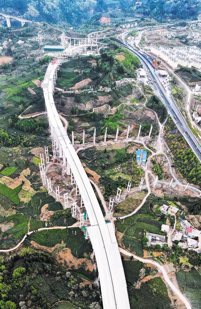 3月22日,贵州省黔西南州,航拍建设中的纳晴高速普安县江西坡镇段新寨河枢纽互通主线特大桥。纳晴高速公路全长160余公里,串联杭瑞、厦蓉和沪昆等国家高速公路主线,建成后将为区域经济发展注入新的活力。李 森摄(中经视觉)
