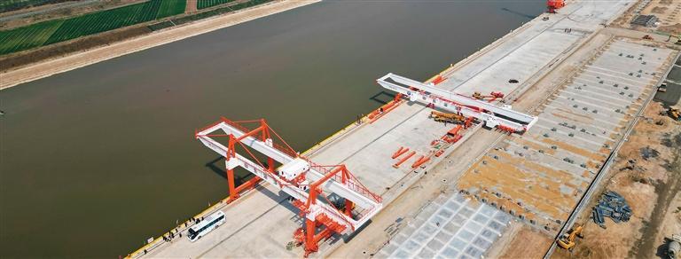 3月21日,济南市小清河复航工程济南港章丘港区施工现场。